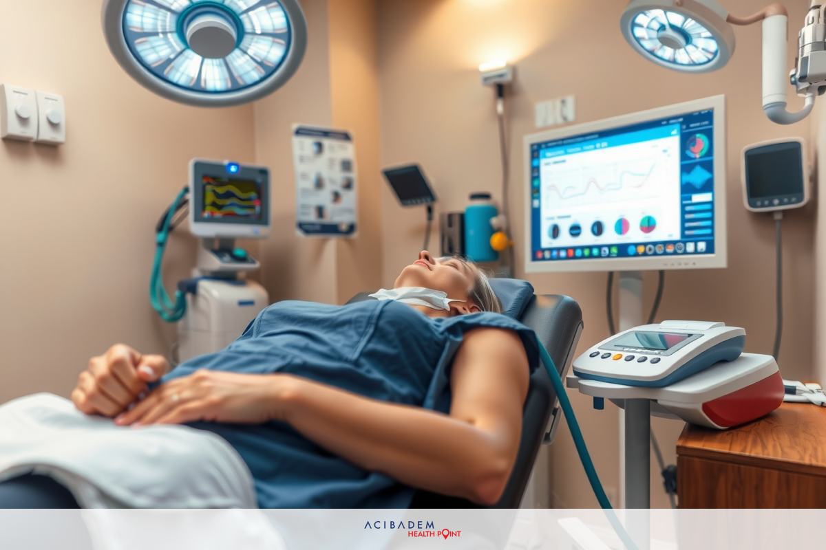 The image shows a clinical setting, possibly a hospital or medical office. A patient is lying face up on an examination table, suggesting that they may be receiving a checkup or treatment. - Smooth Procedure: Proper usage of anesthesia ensures a smoother surgical process by preventing involuntary movements due to pain or discomfort which could potentially interfere with the precision needed for optimal outcomes in laser eye surgeries.