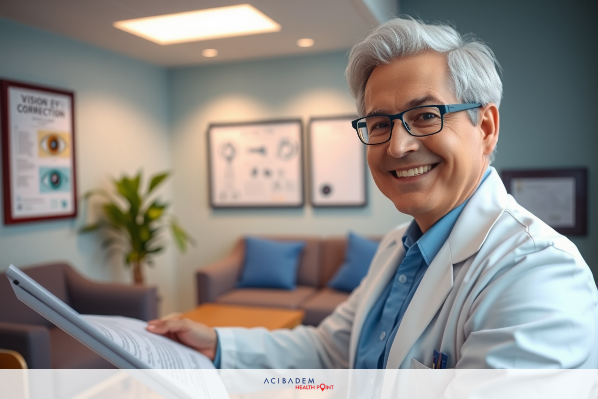 This is a photograph of an older male ophthalmologist. He’s wearing glasses and a medical coat, which indicates his professional status as a doctor specializing in eye health. The background suggests an office setting with various framed certificates or diplomas on the wall, indicating the man’s credentials and achievements in his field. His smile conveys confidence and approachability. - Ask questions: If something about a clinic’s pricing seems unclear or too good to be true, don’t hesitate to ask for clarification directly from them.