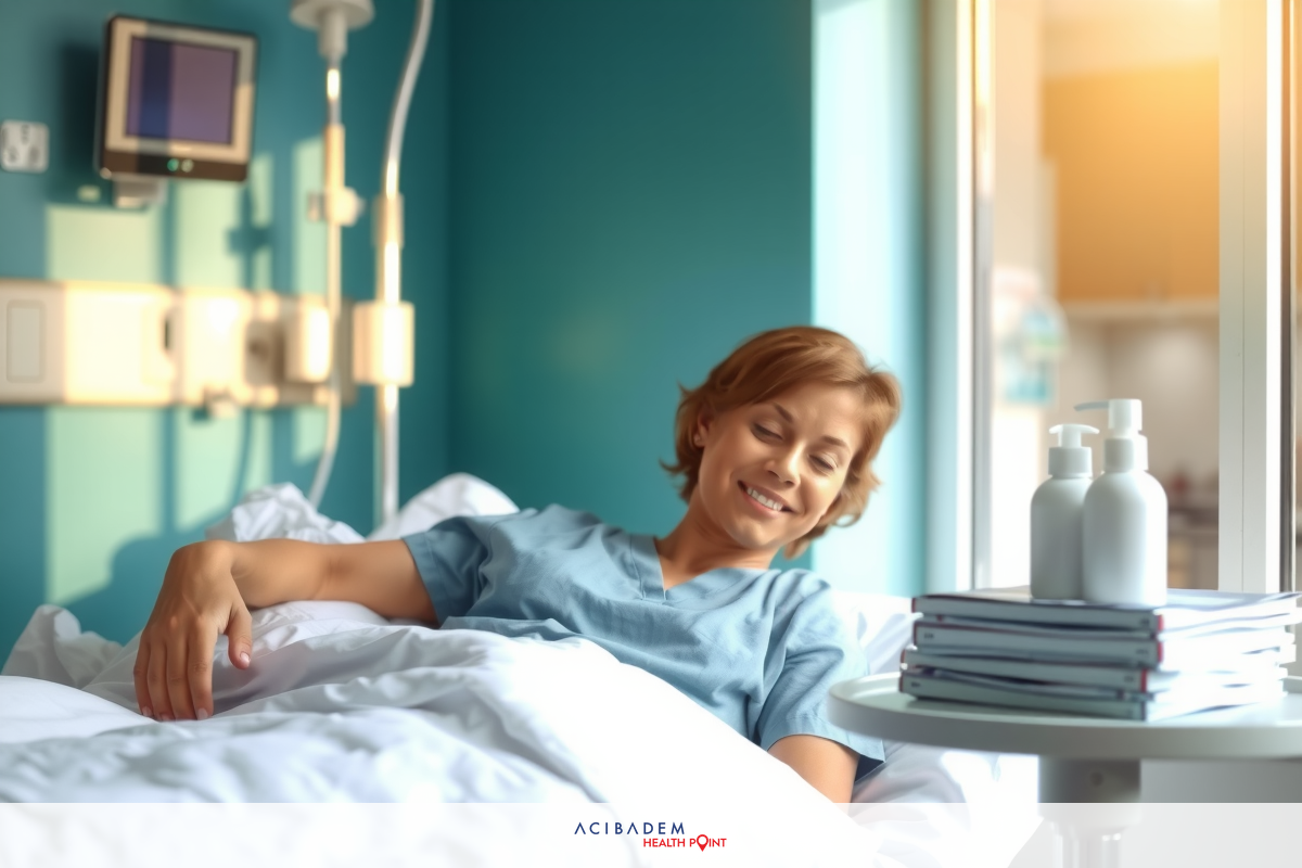 A female nurse in scrubs smiling at the camera from a hospital bed. The room has blue walls and windows with blinds, creating an atmosphere of medical care. from surgery.